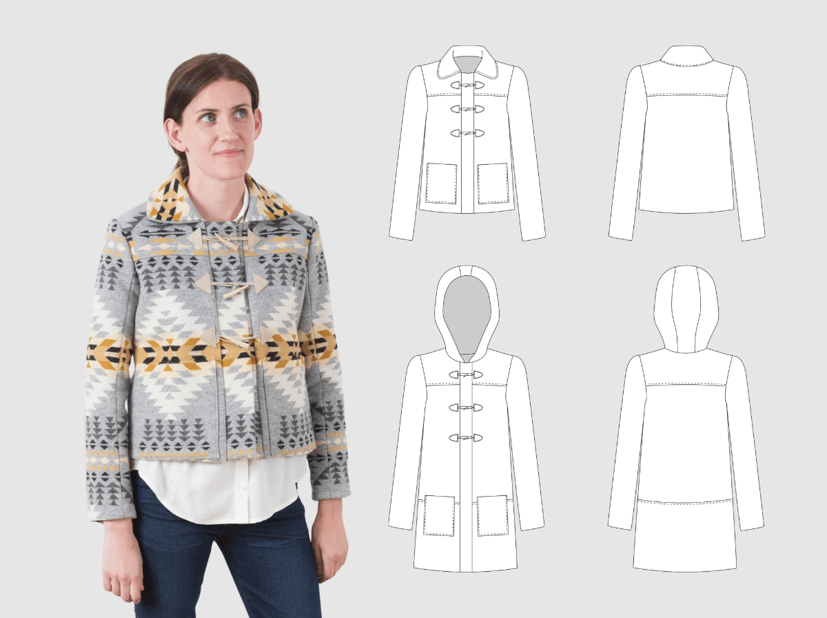 Sew this fresh take on the classic duffle coat with its slight A-line cut and toggle front closure. Learn to construct the hidden zipper band for weather protection, make custom toggle closures, and use the bagged lining method with minimal hand stitching. Choose between hip-length or mid-thigh versions and swap the collar for a hood to create your perfect winter coat.