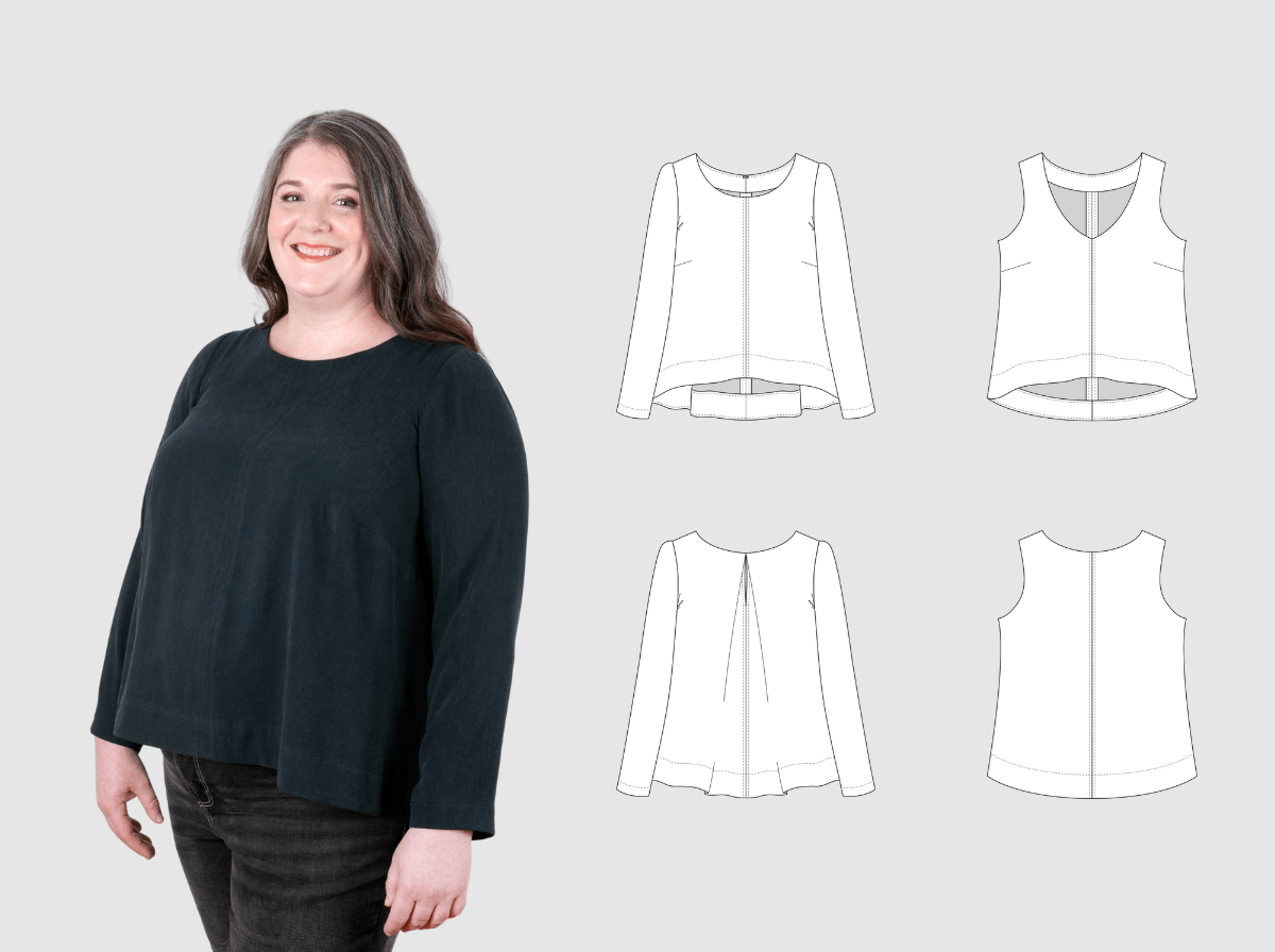 Sew this simple yet elegant top with architectural center seams and deep hem facings. Choose between View A's pleat back with long sleeves or View B's sleeveless V-neck design. This guide covers working with drapey fabrics like rayon and silk noil, plus techniques for both jewel and V-necklines.