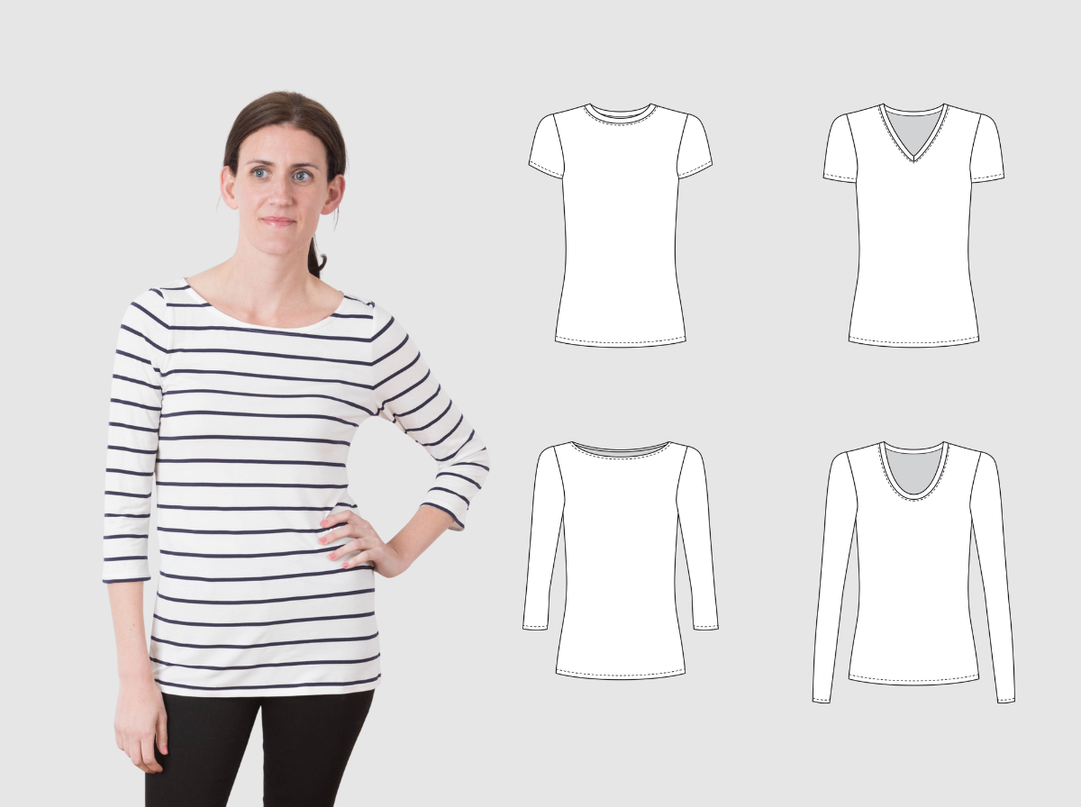 Perfect your knit sewing skills with this modern slim-fit top featuring four interchangeable necklines and four sleeve lengths that combine to create 16 different tees. Learn to work confidently with knit fabrics while mastering crew, scoop, boat, and V-neck finishes plus cap, short, 3/4, and long sleeves. Perfect for layering under blazers and cardigans or wearing solo.